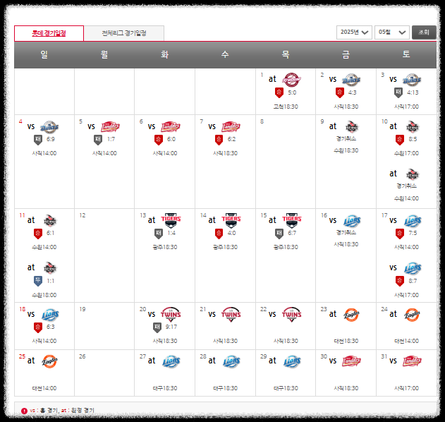 - 5월 31일(금) ~ 6월 2일(일): vs LG 트윈스